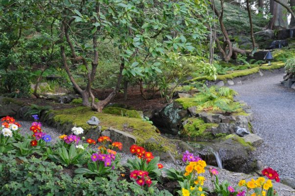 Красиві композиції в саду складаються з примули і інших квітів