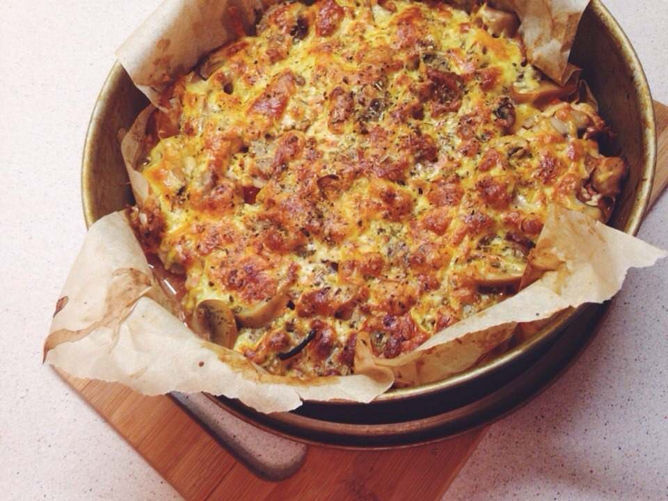- Влити масу в лоток на підготовлену картоплю з томатами і грибами, відправити в духовку.