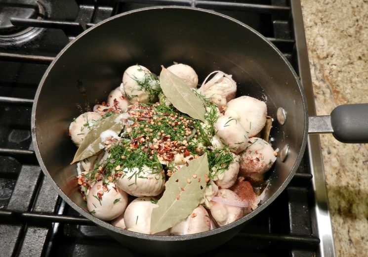 - Довести до кипіння в каструлі весь марінадной набір і викласти в нього підготовлені гриби. У разі сумніву в білизні грибів (польові печериці) попередньо слід їх проварити протягом 10 хвилин, відкинути на друшляк, а далі – по рецепту – в киплячий маринад.