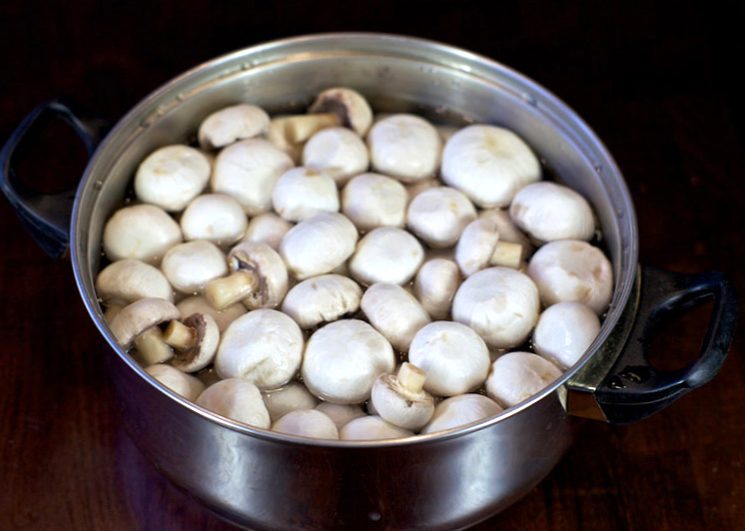 - Підготовлені, перебрані і промиті, печериці відварити в зазначеному обсязі підсоленої води з лавровим листом протягом 15 хвилин.