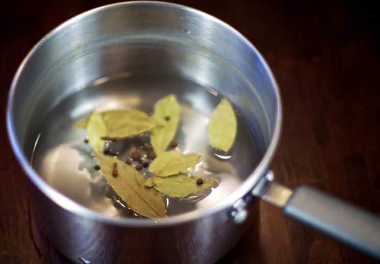 - У відповідну ємність влити 1 літр води, насипати належну кількість солі, перець горошком, очищені цілі зубчики часнику і, помістивши на вогонь, довести маринад до кипіння.