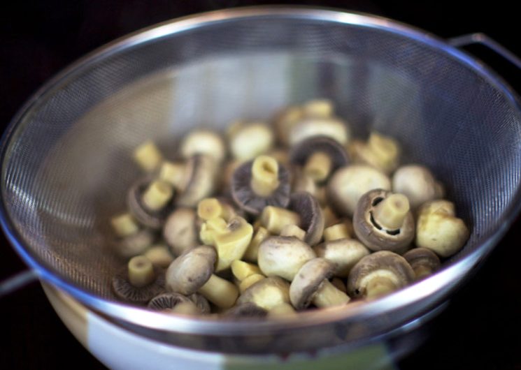 - Печериці, перебрані і вимиті, проварити у воді без додавання спецій і солі протягом 10 хвилин, після чого гриби відкинути на друшляк.