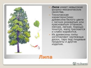 У липи деревина біла, але з відливом рожевого кольору. Характеристики цього матеріалу такі: