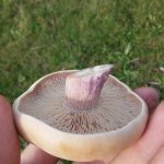- пластинки часто розташовані, тонкі, приростають зубцем або практично вільні, білуватого або блідо-фіолетово-кремового фарбування, з бузковим відтінком;