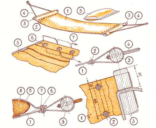 1 – брезентове полотно, 2 люверси, 3 – дерев'яні живці, 4 мотузка-розтяжка, 5 подушка, 6 підгорнутий край брезенту, 7 – край прошивки, 8 – поролон.