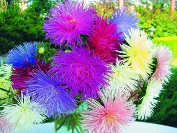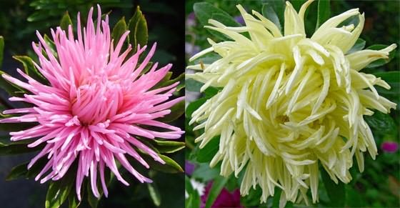 кучеряві айстри – ошатні стрічкові, широкі язичкові квітки, злегка в'ються на кінцях. Королева ринку, Гогенцоллерн, Каліфорнійська Велетенська і стресових перо – для зрізання, Раннє диво, Хрізантемовідная і Комета – універсальні.