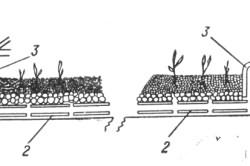 Схема культури рослин в субстраті: 1 -кран, через який надходить живильний розчин; 2 дренажні труби; 3 – захисні коробки; 4 – патрубок; 5 -сіфон для видалення розчину.
