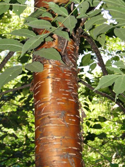 - Черемуха Маака. Основний її плюс – блискуча, лущиться, золотисто-жовта, сіра, мідно-червона або оранжево-жовта кора. Через здатність кори відшаровуватися дерево називають «красунею в лахмітті».