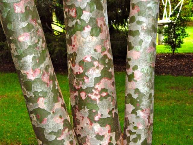 - Стюарт. Дерево може стати цілорічним прикрасою саду. Кора лущиться, забарвлення стовбура – зелена, помаранчева, біла – як ніби-то хтось набризгал на дерево фарбу. Ефект додають помаранчеві листя і рожеві квіти.