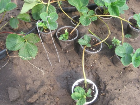 Іноді вуса укорінюють відразу в поживні горщики, які злегка заглиблюють в землю. Цей спосіб отримання розсади має перевагу, оскільки молоду полуницю висаджують з грудкою землі і розсада приживається значно краще.
