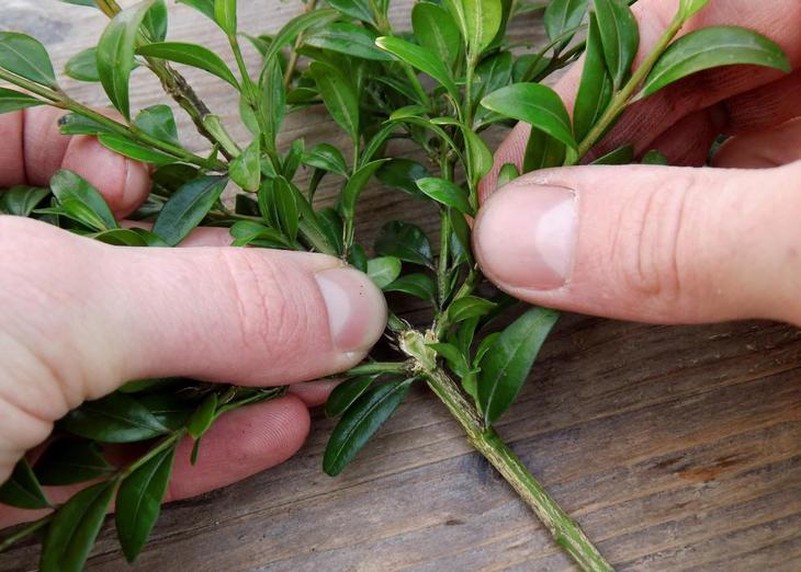 1. Виберіть міцні і здорові паростки самшиту з гарними листами правильної форми і зріжте з них невеликі гілочки, які виросли в цьому році. Довжина живців повинна становити близько 10 см.
