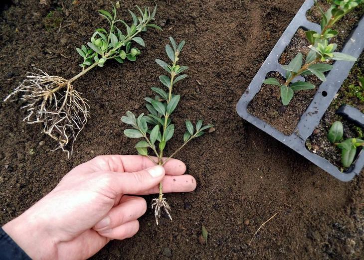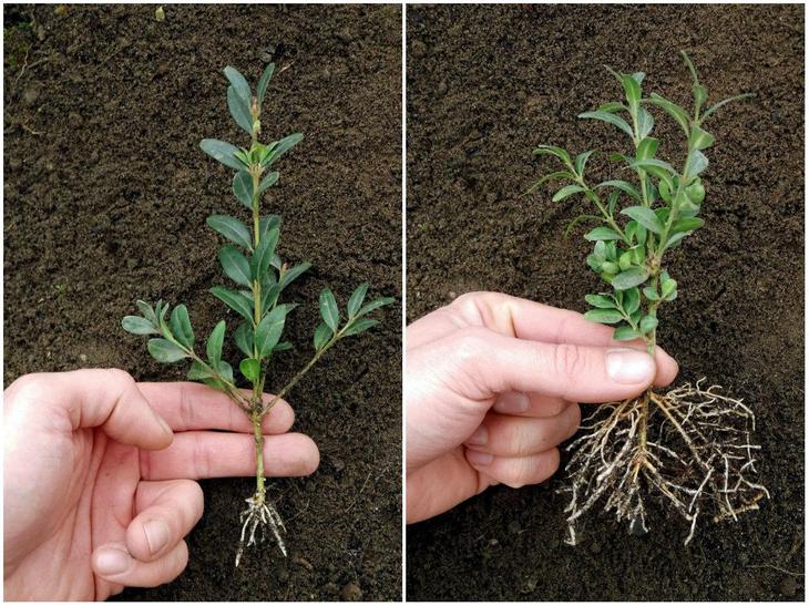Не потрібно обтрушувати коріння від землі, як це показано на картинці. Це зроблено лише для того, щоб ви побачили різницю в розмірі кореневої системи між однаковими на перший погляд живцями. Пересадите живці разом із земляною грудкою – тоді вони краще приживуться на новому місці.