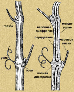 Важливо! При цьому зрізи потрібно робити в середині міжвузля, тобто між очима. Причому найкраще, щоб в нижній частині зрізу живця раніше ріс вусик або була гроно, а точніше була повна діафрагма (див. схему-картинку нижче).