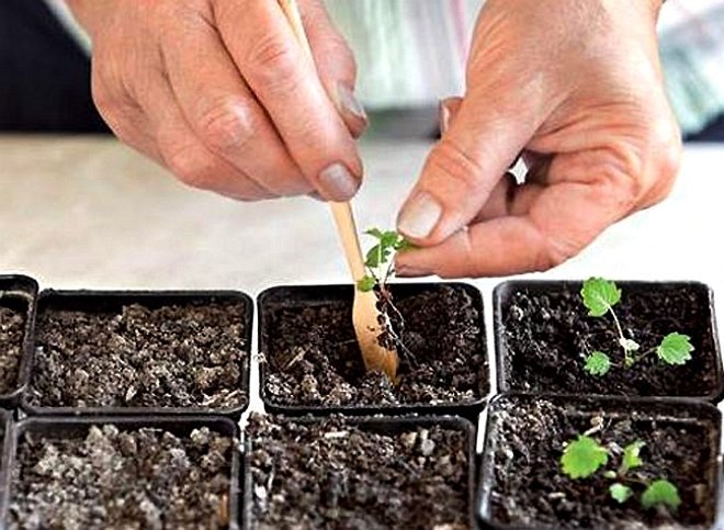 Пересаджують крихітні кущики разом з грудкою землі, щоб не пошкодити коріння, в ємності розміром 9 × 9 см