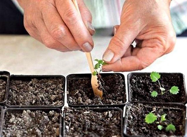 Полуниця погано переносить пікіровку, тому якщо розміри підвіконня або стелажа для розсади дозволяють, бажано відразу сіяти насіння в окремі ємності, наприклад, пластикові стаканчики.