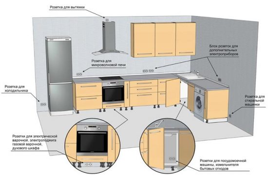 Після складання схеми розташування розеток потрібно розрахувати навантаження. Це потрібно зробити для того, щоб в потрібний момент, коли кухня буде використовуватися по максимуму, не відбулося відключення живлення.
