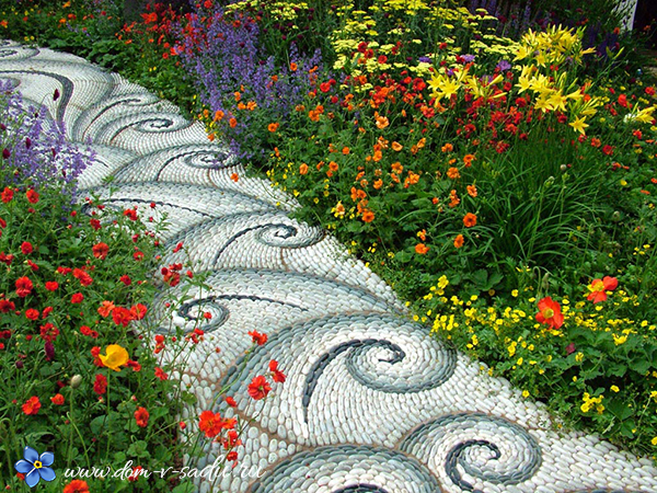 - Садова доріжка з гальки, Виконана у вигляді хитромудрого мозаїчного малюнка додасть шарм і чарівність всьому заміському ділянці.