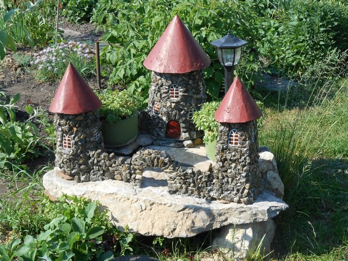 З каменю на своїй ділянці можна зробити справжній середньовічний замок. Для його створення вам будуть потрібні обрізки труби, бита керамічна плитка, каміння, пластикові пляшки і цемент.