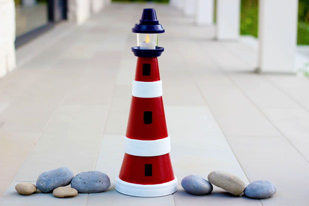 Отже, спочатку на рідкі цвяхи до кожного кашпо кріпиться піддон. Потім горщики з піддонами кріплять один до одного так, щоб найменший був вгорі, а найбільший внизу. Потім конструкцію розфарбовують фарбами. Зверху на маяк прикріплюють ліхтарик. Процес виготовлення фігурки не займе і години. Розташувати виріб можна на галявині.