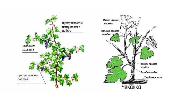 - Обрізати кущі. У 1-й рік після висадки не проводиться, починають обрізати виноград тільки на 3-й рік. Відбувається формування крони і рукава.