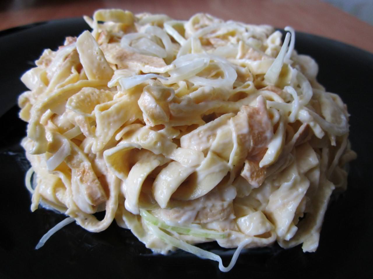 - На дно салатниці викладаємо шар копченої курки, потім шар яєчних млинців і в самому кінці викладаємо кільця маринованої цибулі. Щедро змащуємо все майонезом і даємо просочитися протягом 30-60 хвилин (за бажанням).
