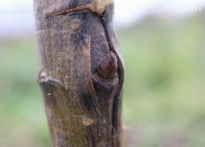 Результат окулірування ниркою (вічком) добре видно на цій фотографії: навесні ця нирка стане активною, і нова гілка матиме всі ознаки прищепленого сорту