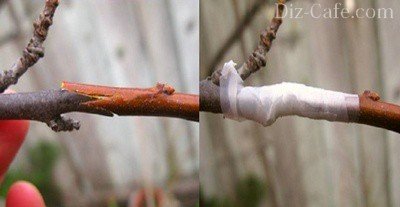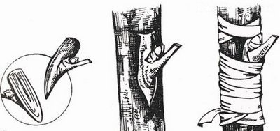 Готуємо підщепу, для чого надрезаем на ньому кору і частково її відокремлюємо. Навесні зробити це дуже легко. Надріз повинен вийти у вигляді літери «Т». Відгинаємо куточки і отримуємо кишеньку, який за розміром має збігатися з привоєм. Якщо щиток виявився завеликий, підрізаємо його. Нирка вставляється в утворився кишеню точним рухом зверху вниз. Робимо це акуратно, притримуючи щепу за верхню честь щитка. Фіксуємо положення нирки обв'язкою з плівки.