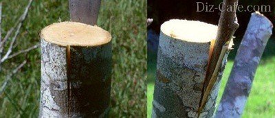 На бічній поверхні підщепи робиться надріз в глибину так, щоб до протилежного боку залишалося приблизно 3 см. Прорізаємо в довжину 4-5 см. У нижній частині живця роблять зріз таким чином, щоб утворився двогранний клин. Вставляємо клин в розщепів на підщепі. Його широка сторона повинна збігатися з зовнішньою поверхнею гілки. Міцно фіксуємо положення держака.