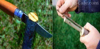 З держака знімаємо нирку. Для цієї роботи нам потрібен гострий ніж. Погано заточеним інструментом можна пошкодити щеплення матеріал і привести його в повну непридатність. Разом з ниркою зрізаємо щиток – невелику ділянку кори. Деревини при цьому намагаємося захопити якомога менше. Якщо роботи проводяться влітку, то над ниркою і під нею в 1,5-2 см робиться надріз, після чого вона зрізається зліва направо. Якщо справа відбувається навесні, нижній щиток має сенс зробити довше на 1-1,5 см.