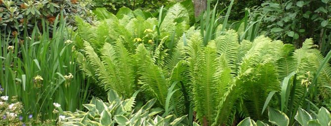 Центром Тіньолюбні клумби можуть виступити надзвичайно красиві витончені папороті: чістоус величавий, страусник і щитовник чоловічий.