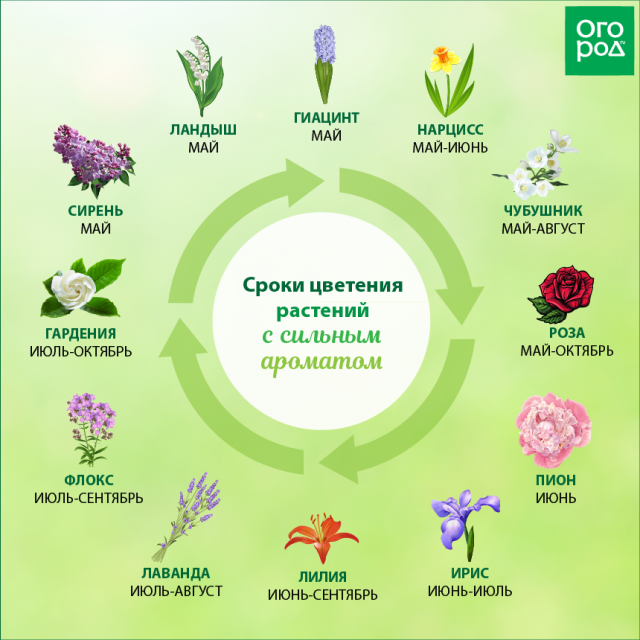 Квіти з сильним ароматом будуть прекрасно виглядати в різноманітних комбінаціях. На схемі нижче ми показали приблизні терміни цвітіння популярних рослин, щоб ви могли спланувати майбутні посадки.