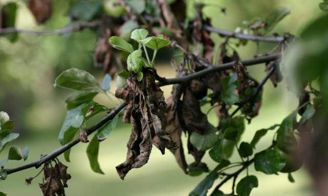 При бактеріозу вся рослина виглядає обпаленим – листя, гілки, стовбур, плоди. Спершу все дерево покривають чорні плями, потім листя скручуються і обпадають. Плоди темніють, зупиняються в розвитку і псуються.