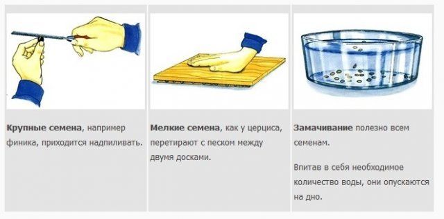 Великі насіння, які можна взяти двома пальцями, надрізають напильником. А дрібні – кладуть на дошку, посипану великим піском, накривають другою дошкою і перетирають до тих пір, поки їх оболонка не трісне.