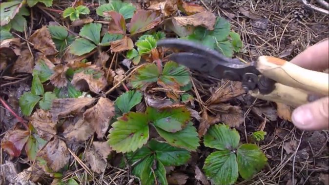 - Частка рослин. З-під снігу кущики суниці з'являються неохайними, з сухими листям, залишками вусів, можливо, подекуди залишилися незірваних квітконоси. Всі ці частини рослин також видаляють, але не відривають, а зрізають садовими ножицями і знищують. Зробити це можна не тільки спалюванням, а й прікапиваніем, бажано подалі від суничної грядки. Девіз деяких садівників і городників «Все в компост» для полуниці недоречний і може мати дуже сумні наслідки, так як ця ягода дуже ніжна і компост для неї повинен містити тільки нешкідливі елементи.