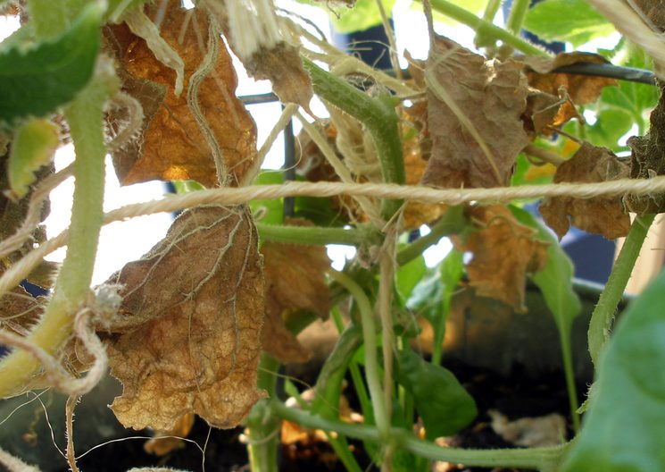 Згодом вони розростаються і частіше зливаються. На нижній частині листя теж виникає густий сірувато-фіолетовий наліт, під впливом якого листя кривляться, стають бурими і відмирають, стаючи ламким, і обпадають або гниють.