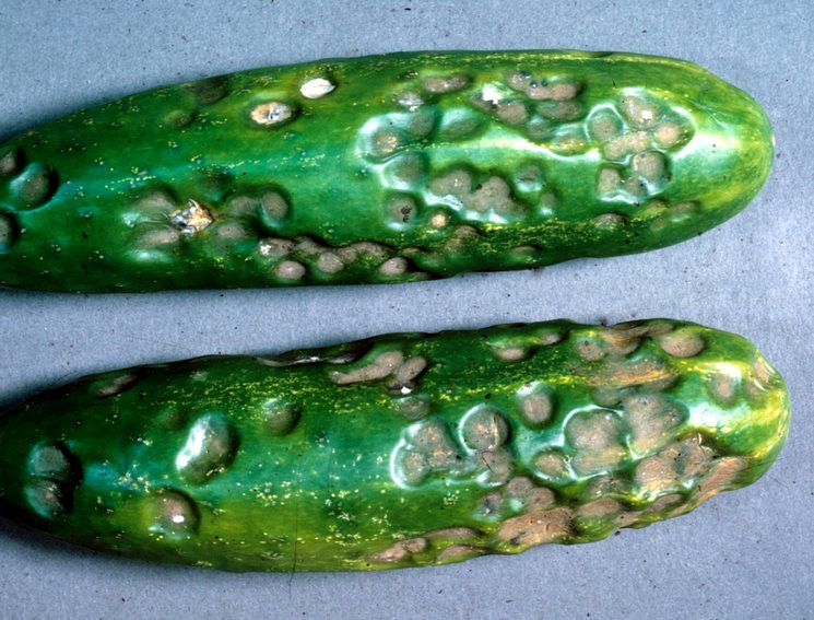 Огіркові плоди покриваються одиночними або декількома поглибленнями у вигляді плям або виразок. При тривалої вологої погоди ці виразки опушувалися мідно-рожевим нальотом, який далі до чорноти темніє і ущільнюється, на смак такі огірки гіркі, а транспортування не витримують – гниють повністю.