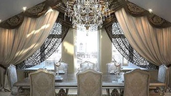 Це відмінне рішення для косих форм. Їх шиють з різних тканин, що розширює можливості при оформленні. Зі зворотного боку полотна закріплюються жорсткі рейки з петлями для підвішування. Металеві обважнювачі забезпечують натягнутість розкритою тканини, і освіту при підйомі красивих складок.