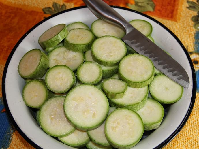 - Цукіні вимити, відокремити від плодоніжки, порізати кружальцями.