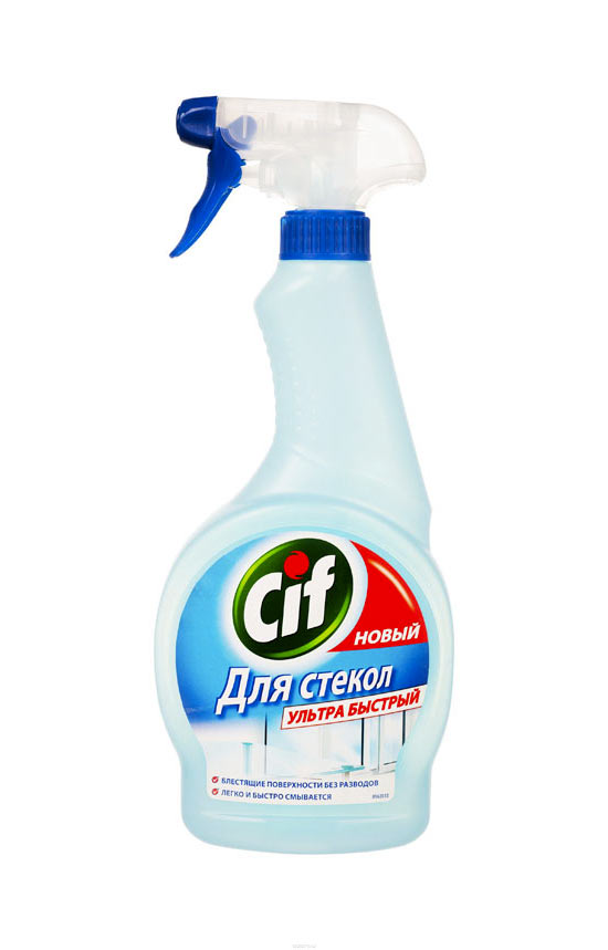 Засіб для миття вікон CIF. Мабуть, це одне з найпопулярніших склоочисних коштів, яке містить в своєму складі спирт. Воно порівняно дороге, але чудово очищає поверхню від забруднень без зайвих розлучень.