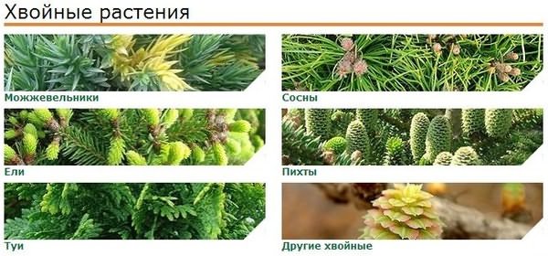кедр, кипарис, ялиця, ялівець, модрина, ялина, сосна, секвойя, тис і каурі.