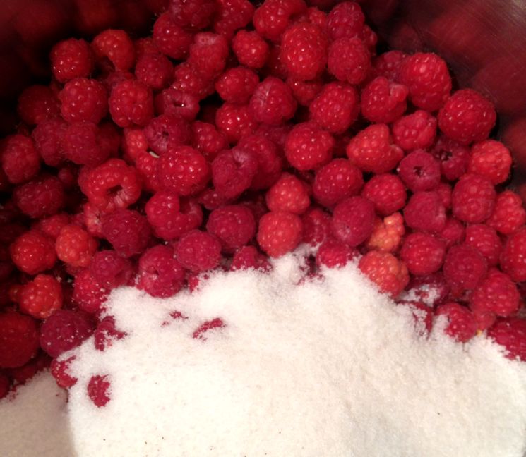 Пропорції цукру і ягід малини з розрахунку: 1 кілограм малини на 1 кілограм цукрового піску. Малину слід попередньо пересипати цукровим піском пошарово: шар цукру, шар малини, шар цукру повинен бути останнім при будь-якому листкове. Засипану цукром малину залишити для сокоотделения на 4-5 годин в можливо в прохолодному місці.