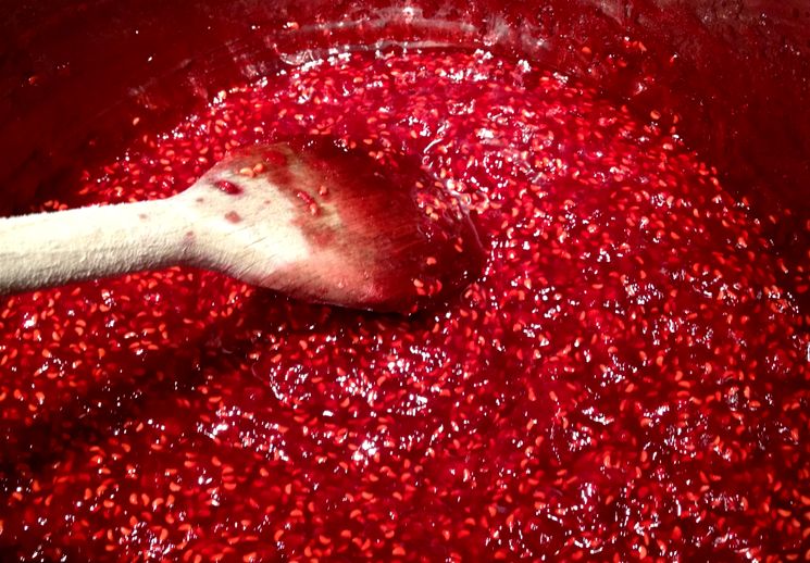 - Підготовлену чисту малину вагою в 1 кілограм заливають 200 мілілітрах води відразу в посуді, де вона буде варитися, і ставлять на середній вогонь до закипання. Вогонь зменшують і варять далі не більше 3 хвилин.