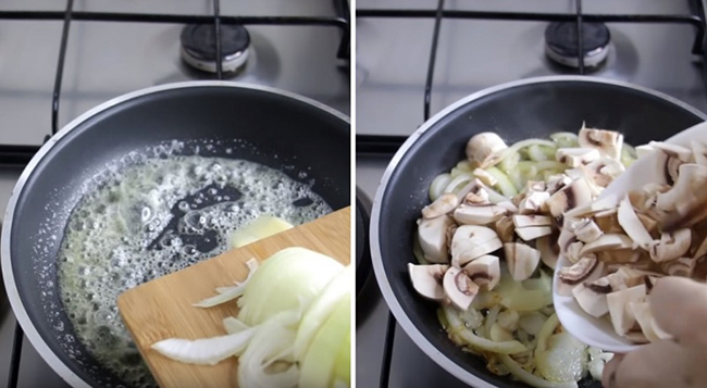 Крок 1. Відваріть яйця і куряче філе. Лук наріжте півкільцями, обсмажити його на вершковому маслі до прозорості, а потім додайте до цибулі нарізані гриби. Обсмажуйте до тих пір, поки з грибів не випарується вся волога.