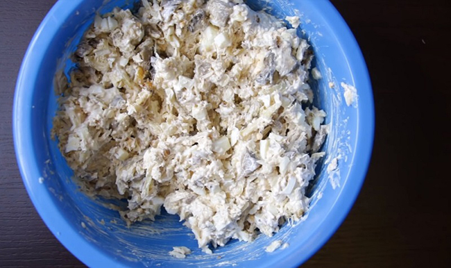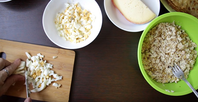 Крок 7. Поверх млинців рівномірно розподіліть курячий салат, злегка утрамбовувавши його. Надішліть форму в холодильник на 3-4 години.