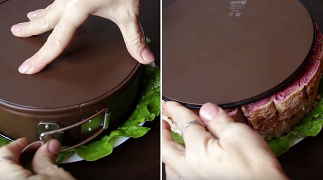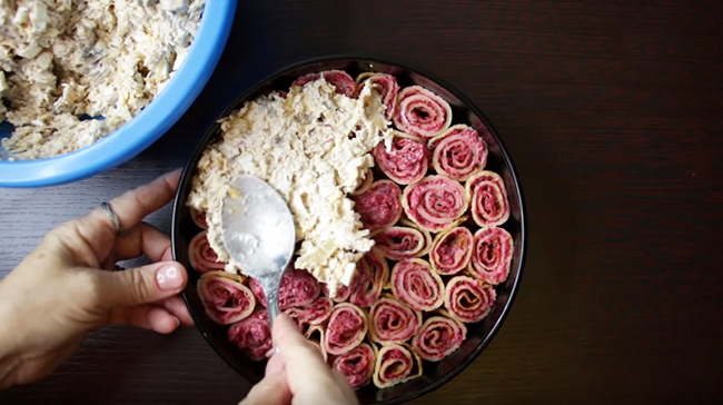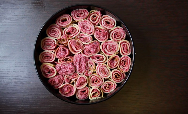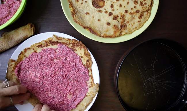 Крок 3. Акуратно приберіть стінки форми і зніми дно. У щілини між млинцями покладіть трохи салату, імітуючи листя троянд. Ефектне страва готова відправитися на стіл!