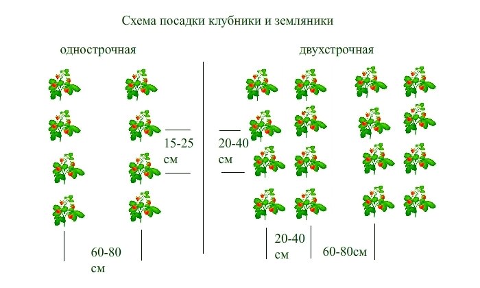 - якщо ділянка під посадку рівний і піднесений, то садову суницю слід садити згідно одно- або дворядкового схемою;