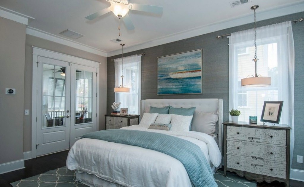 - Спальня в блакитних тонах з додаванням сірого. Варіант передбачає використання третього кольору. Вдало поєднання сірого, блакитного і білого (світлого бежевого). Гарне враження справляє поєднання – срібляста або сіра меблі на тлі блакитної оздоблення стін;