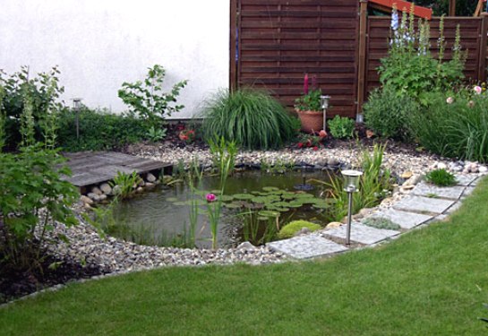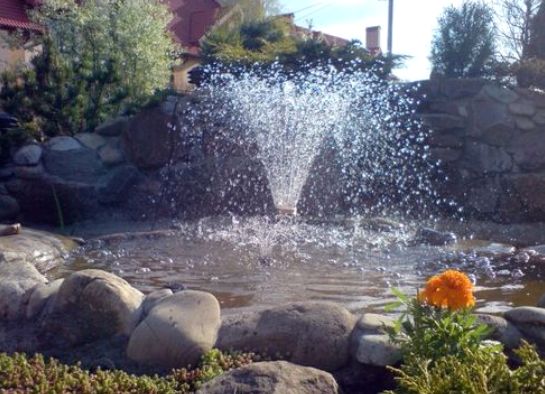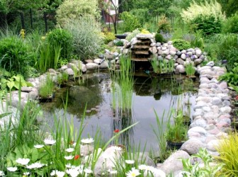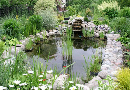 Коли територія біля будинку досить велика, зі значною кількістю різноманітних рослин, то необхідно зробити водойму відповідним за розмірами. Заздалегідь потрібно подбати про те, щоб в ставку не застоювалася вода. Цього можна домогтися за допомогою потічків, які будуть воду переносити по колу, з чаші назад у водойму.