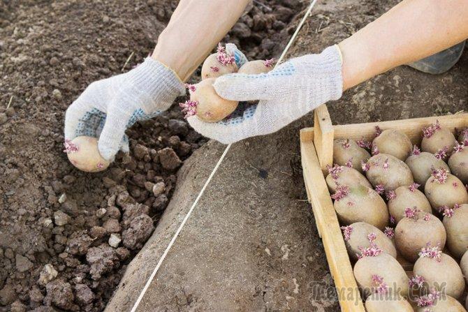 Вміст траншей до весни трохи осяде. Тут стане в нагоді земля, яку залишали по краю канавок. Її засипають в траншеї до повного заповнення. Для кожного картопляної бульби роблять своєрідну «підстилку» через кожні 30 сантиметрів. У неї входить: невелика жменю лушпиння цибулі і сухого пташиного посліду, а також столова ложка деревної золи. Прямо на шар попелу викладають бульби і присипають звичайної землею з ділянки.