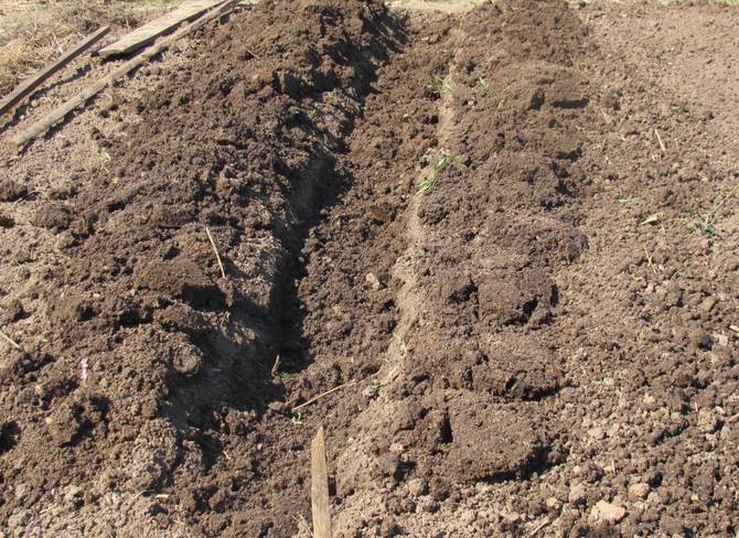 Довжину траншеї визначаєте самі, а глибина становить близько 40 сантиметрів. Землю з траншеї складають по краю з одного боку. Наступну траншею копають приблизно через 70 сантиметрів. Таким способом потрібно перекопати весь підготовлений під картоплю ділянку.